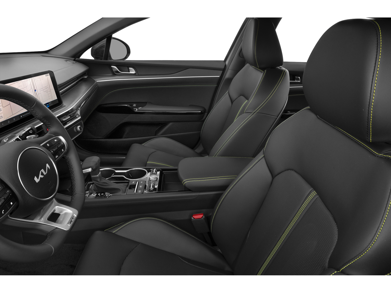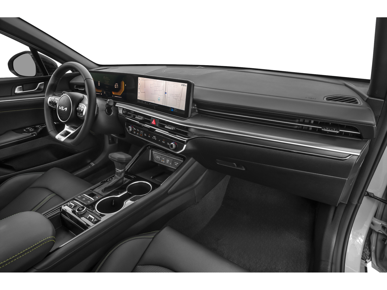 Front dual zone A/C, Heated Sport Bucket Seats, Navigation System, Power moonroof, Power windows, SynTex Seat Trim, Wheels: 19 x 8.0J Gloss Black Machined Finish Alloy, 4-Wheel Disc Brakes, 6 Speakers, ABS brakes, Alloy wheels, AM/FM radio: SiriusXM, Auto High-beam Headlights, Automatic temperature control, Brake assist, Bumpers: body-color, Cargo Net, Carpeted Floor Mats, Delay-off headlights, Driver door bin, Driver vanity mirror, Dual front impact airbags, Dual front side impact airbags, Electronic Stability Control, Emergency communication system: Kia Connect (includes 1 year free trial), Four wheel independent suspension, Front anti-roll bar, Front Center Armrest, Front fog lights, Front reading lights, Fully automatic headlights, Heated door mirrors, Illuminated entry, Knee airbag, Leather Shift Knob, Leather steering wheel, Low tire pressure warning, Occupant sensing airbag, Outside temperature display, Overhead airbag, Overhead console, Panic alarm, Passenger door bin, Passenger vanity mirror, Power door mirrors, Power driver seat, Power steering, Radio data system, Radio: AM/FM Audio System, Rear anti-roll bar, Rear reading lights, Rear seat center armrest, Rear side impact airbag, Rear window defroster, Remote keyless entry, Security system, Speed control, Speed-sensing steering, Split folding rear seat, Sport steering wheel, Steering wheel mounted audio controls, Tachometer, Telescoping steering wheel, Tilt steering wheel, Traction control, Trip computer, Turn signal indicator mirrors, and Variably intermittent wipers.